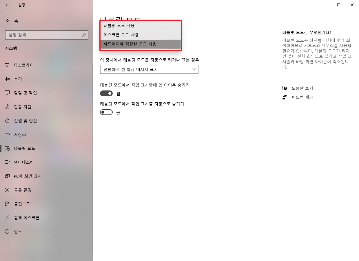이와 같은 부분으로 태블릿 모드에 대한 설정을 진행할 수 있습니다.