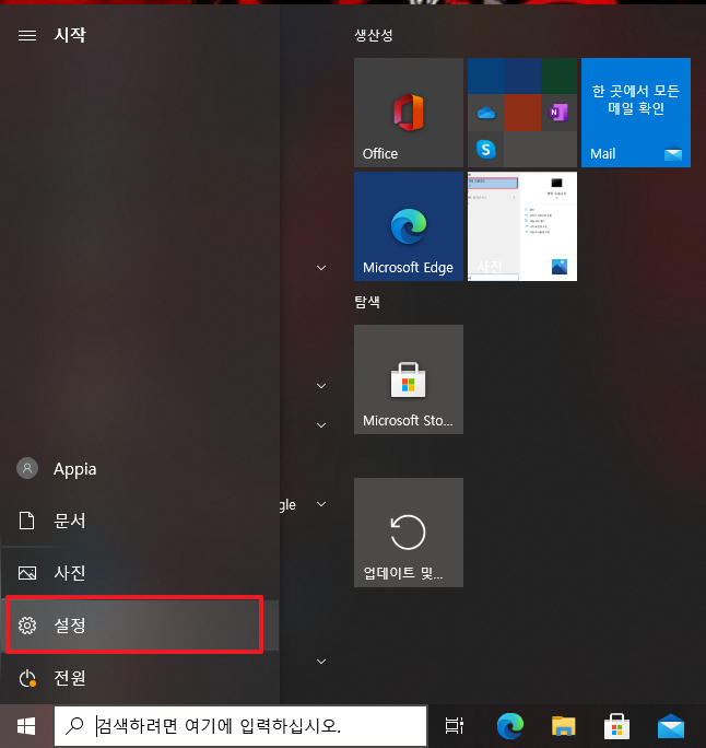 먼저, [윈도우 키]를 누르셔서 메뉴를 활성화 시켜주시길 바랍니다. 그런 후에 [설정]아이콘을 클릭하여 주시길 바랍니다.