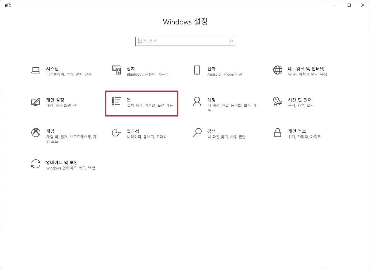 위에서 [설정] 아이콘을 클릭하면 다음과 같이 Windows 설정 메뉴가 나타납니다. 여기에서 [앱]부분을 클릭하여 주시길 바랍니다.