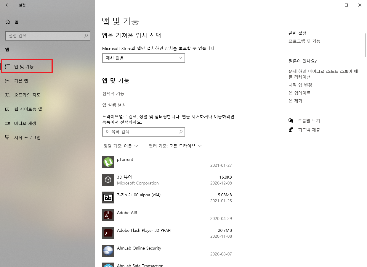 위에서 [앱]부분을 클릭하시면 다음과 같은 메뉴가 나타날 것입니다. 만약 [앱 및 기능]메뉴가 나타나지 않는다면, 좌측에 [앱 및 기능]부분을 클릭하여 주시길 바랍니다.