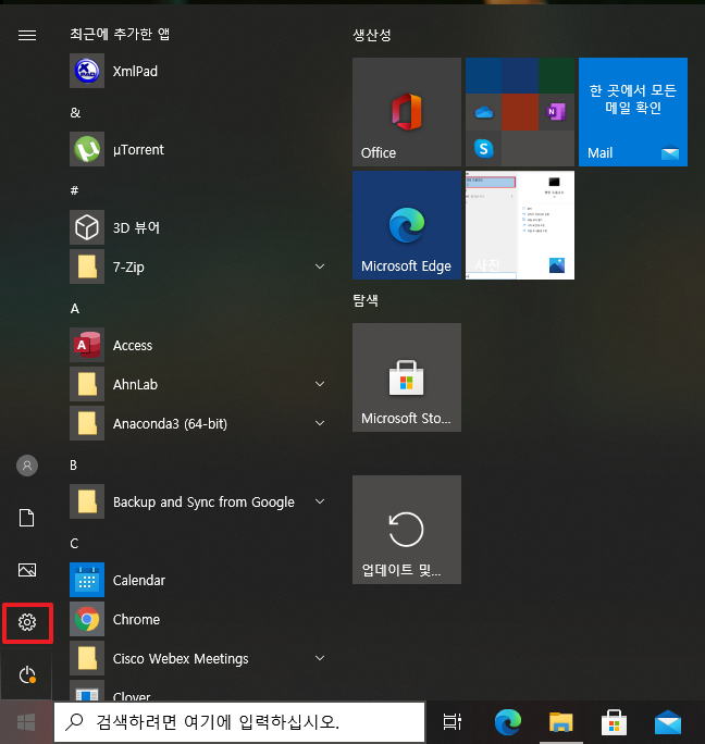 먼저, [윈도우키]를 누르셔서, 메뉴를 활성화 해줍니다. 그런 후에 화면에서 보이는 바와 같이 [설정] 아이콘을 클릭하여 주시길 바랍니다.