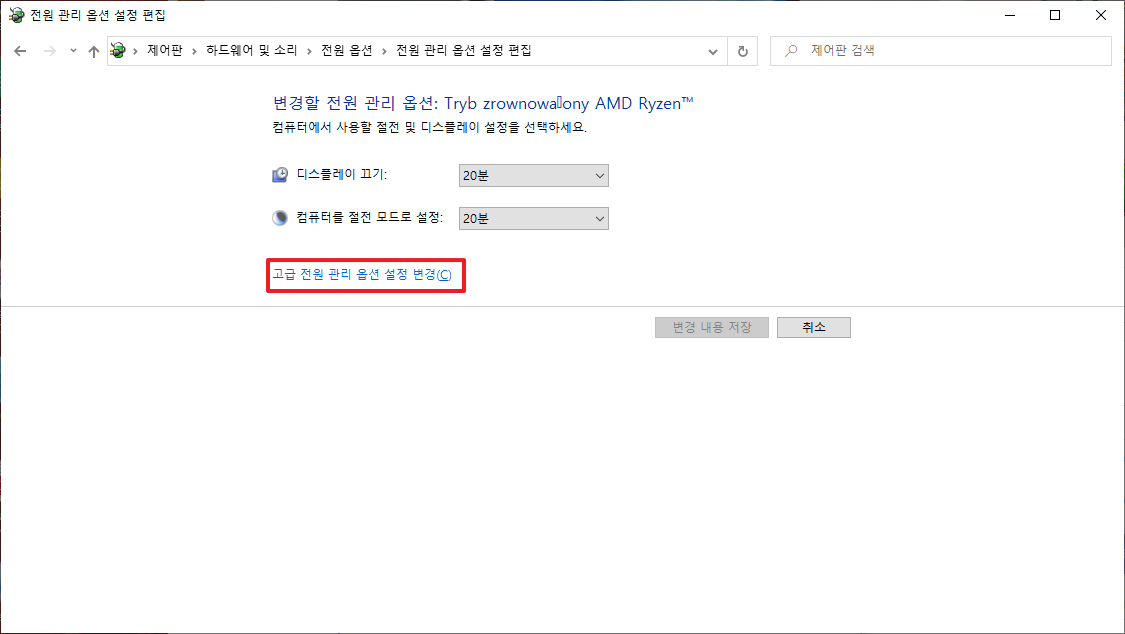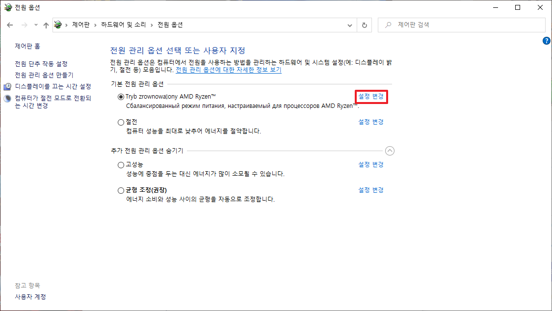 전원옵션에서는 다양한 메뉴가 나타납니다. 여기에서 기본 전원 관리 옵션에서 절전 모드가 아닌 부분의 [설정 변경]부분을 클릭하여 주시길 바랍니다. 절전 모드의 설정을 변경하시는 것에 대해서는 무의미한 전원 소비가 이루어지기 때문에 절전 부분이 아닌 부분의 [설정 변경] 부분을 클릭하여 주시길 바랍니다.