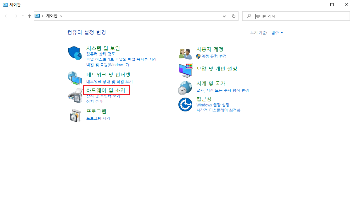 위에서 [제어판] 부분을 실행하시면 다음과 같은 메뉴가 나타납니다. 여기에서 [하드웨어 및 소리]부분을 클릭하여 주시길 바랍니다.