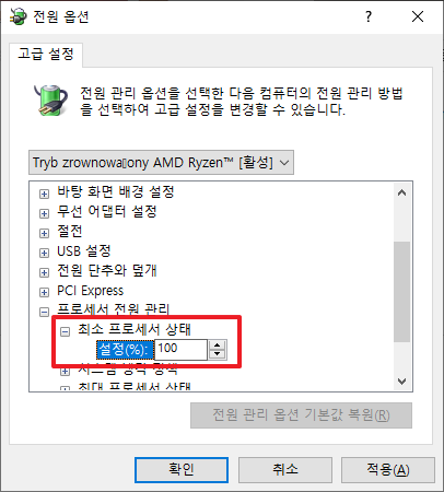 그럼 전원 옵션이 나타날 것입니다. [프로세서 전원 관리]부분의 앞 부분의 [+]부분을 클릭하여 하위 메뉴를 활성화 해주시길 바랍니다.