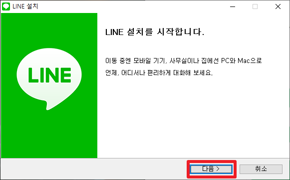 언어를 선택하시고 나시면 바로 라인(Line) 설치가 진행이 됩니다. 여기에서 시작을 확인하시고, [다음]부분을 클릭하여 주시길 바랍니다.