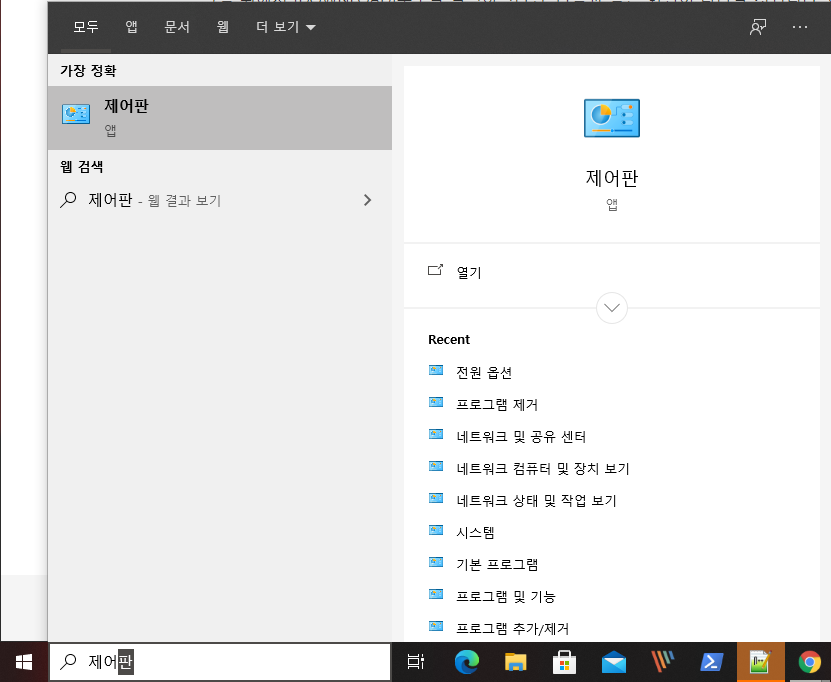 이때, 클릭 없이 그냥 "제어판"을 입력하여 제어판을 검색해주시길 바랍니다. 아마도 "제어판"입력하시면 다음과 같은 아이콘이 나타날 것입니다. 이 때 이 아이콘을 클릭하여 주시길 바랍니다.