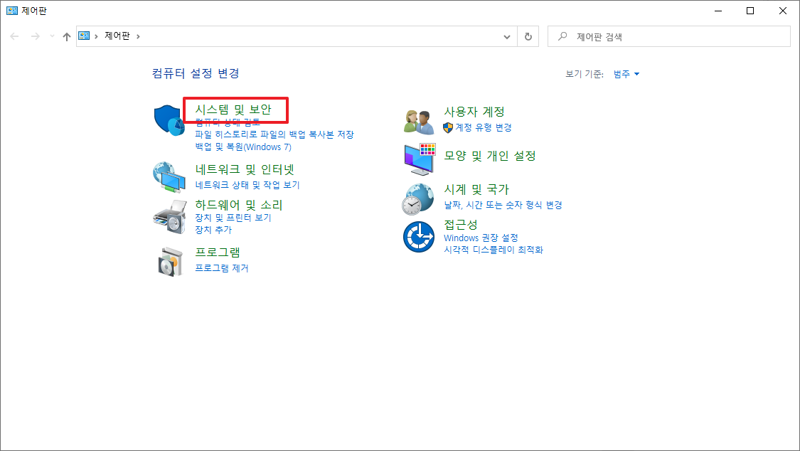 위의 과정에서 [제어판]을 실행하시면 다음과 같은 화면이 나타날 것입니다. 이 때, 상단에 보이는 [시스템 및 보안]부분을 클릭하여 주시길 바랍니다.