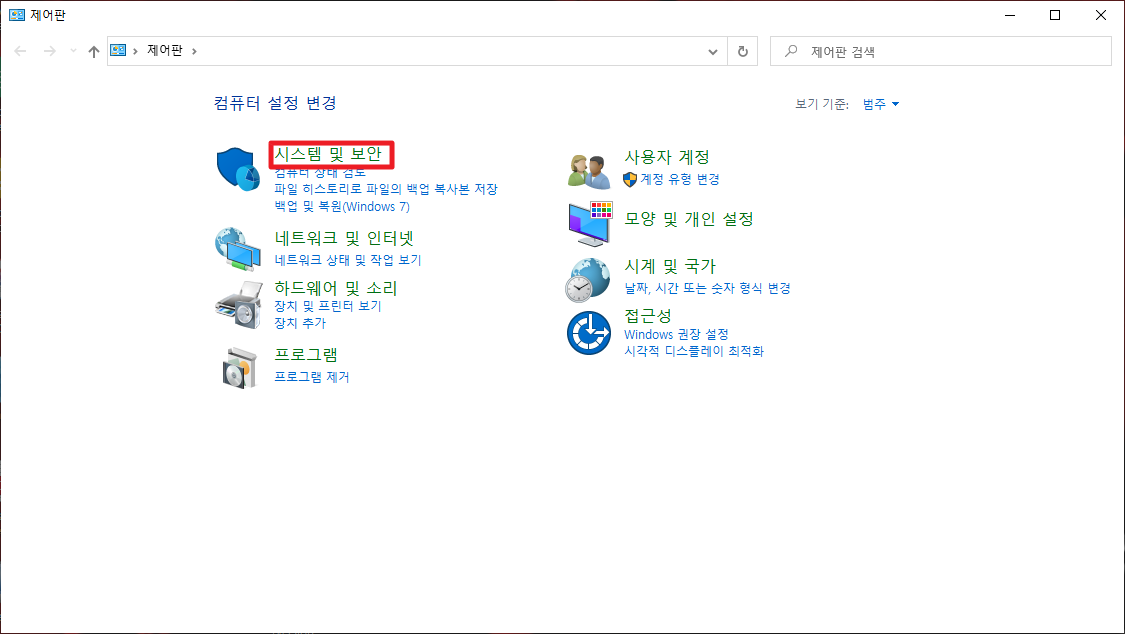 제어판을 실행하시면 다음과 같은 화면이 나타날 것입니다. 여기에서 [시스템 및 보안]부분을 클릭하여 주시길 바랍니다.