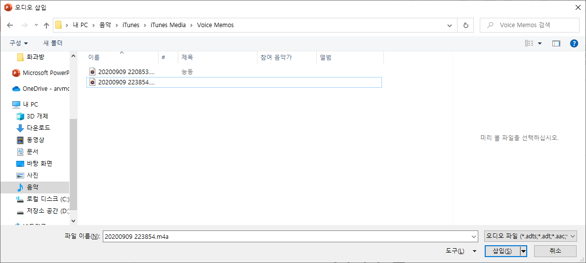 그럼 다음과 같은 화면에서 배경으로 음악으로 사용할 파일을 선택하여 [삽입]을 클릭하여 주시길 바랍니다.