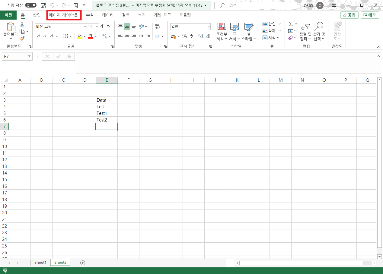 먼저, 엑셀(Excel)을 실행시키시고, 원하시는 파일을 불러와 주시길 바랍니다. 그런 후에 상단에 [페이지 레이아웃]메뉴를 클릭하여 주시길 바랍니다.