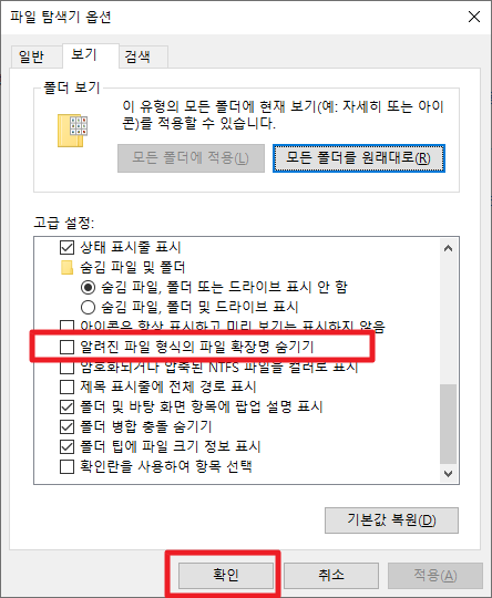 이와 같은 방법으로 탐색기 옵션을 통해서 파일 확장자를 표시할 수 있습니다.