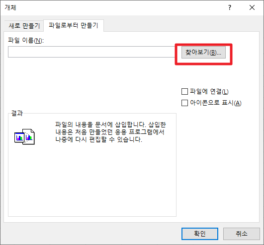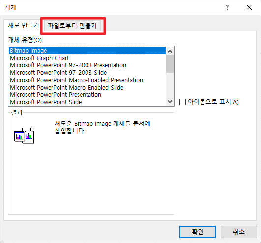 그럼 다음과 같이 앞선 화면에 파일이름등이 추가되었습니다. 여기에서 [아이콘으로 표시]부분을 선택하시고 [확인]부분을 클릭하여 주시길 바랍니다.