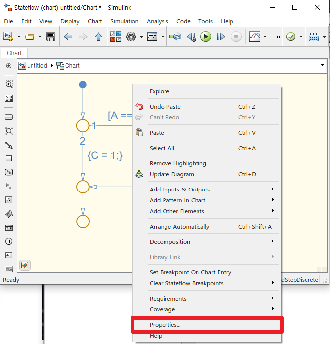 일단 Stateflow의 화면에서 우측 버튼을 누르면 메뉴들이 나타납니다. [Properties] 메뉴를 눌러주세요.