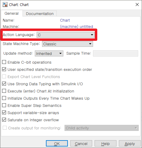 그런 후 [OK]를 눌러보면 처음 봤던 MATLAB 로고 표시가 되어 있는 Action Language 부분이 다음과 같이 C로 표시 되됨을 알 수 있습니다.