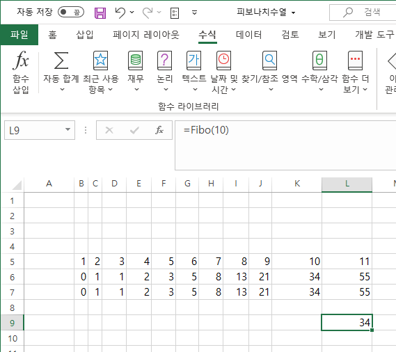 비주얼베이직(Visual Basic, VBA) 엑셀(Excel)에서 사용할 수 있는 피보나치 수열 함수 만들기 본문