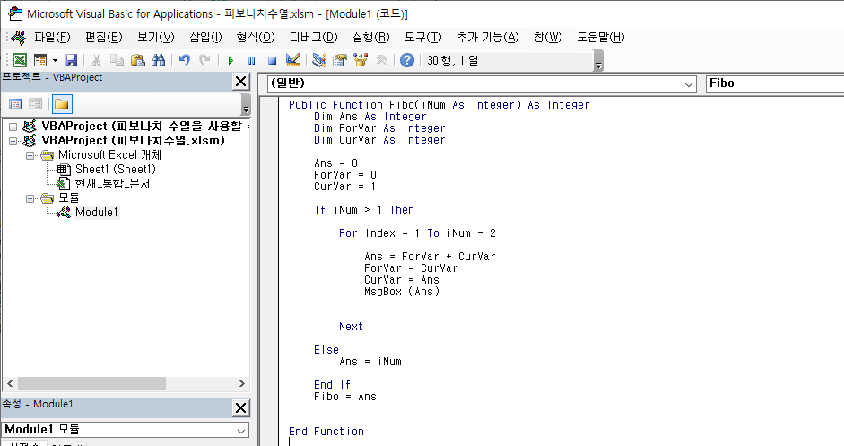 비주얼베이직(Visual Basic, VBA) 엑셀(Excel)에서 사용할 수 있는 피보나치 수열 함수 만들기