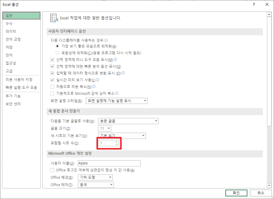 그럼 다음과 같은 화면이 나타날 것입니다. 여기에서 "새 통합 문서 만들기" 부분에서 포함할 시트 수 부분에서 문서 생성시에 같이 포함되길 원하는 시트(Sheet)수를 입력하여 주시길 바랍니다.