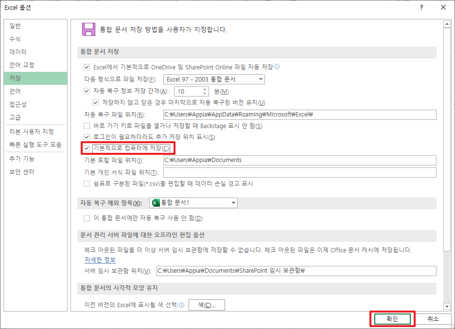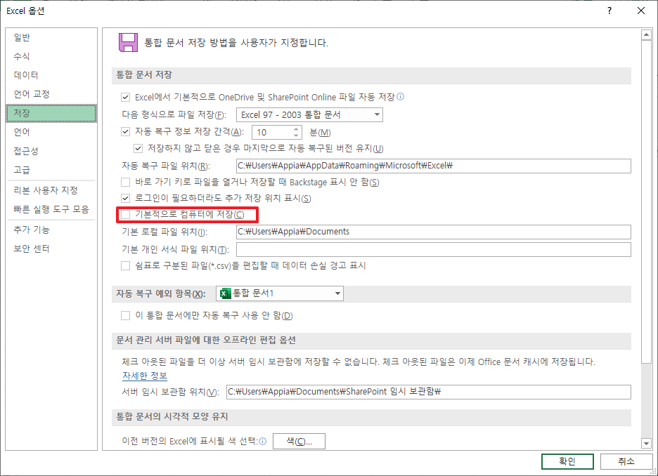 엑셀[Excel] 저장시 기본 경로를 원드라이브(OneDrive)에서 내컴퓨터로 변경하기