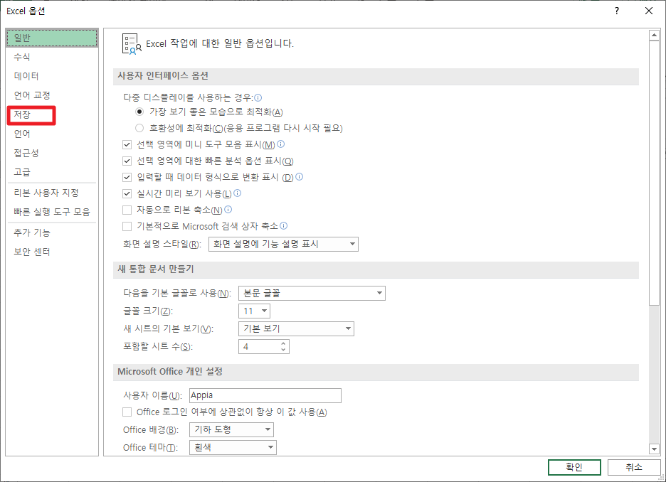 그럼 다음과 같이 Excel 옵션 메뉴가 나타납니다. 여기에서 [저장]탭을 클릭하여 주시길 바랍니다.
