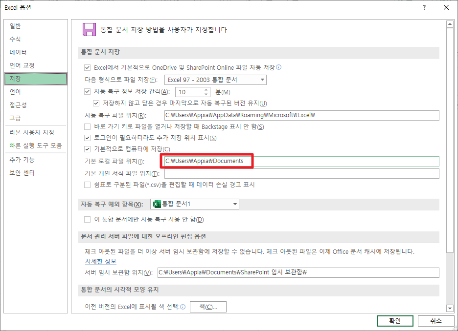 엑셀[Excel] 저장시 기본 저장되는 경로 폴더 변경하기