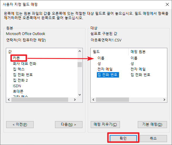 그럼 후에 원하시느니 정보를 선택하신 후 드래그 하여 대상쪽으로 옮겨 주시면 됩니다.
