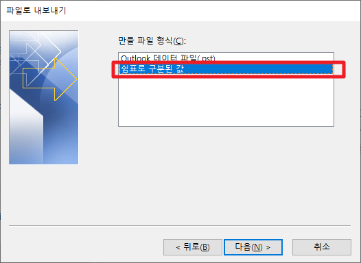 여기에서 [쉼표로 구분된 값]을 선택하여 주시길 바랍니다.