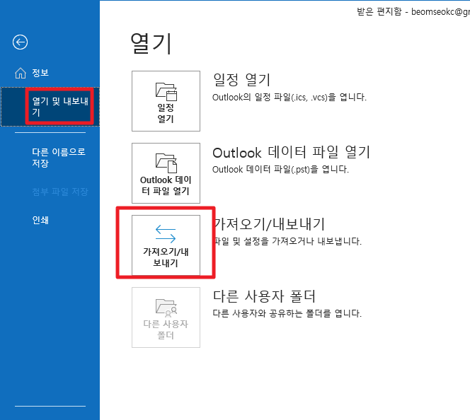 파일 메뉴에서 좌측에 존재하는 [열기 및 내보내기]부분을 클릭하여 주시길 바랍니다. 그런 후에 가운데 부분에 있는 [가져오기/내보내기]부분을 클릭하여 주시길 바랍니다.
