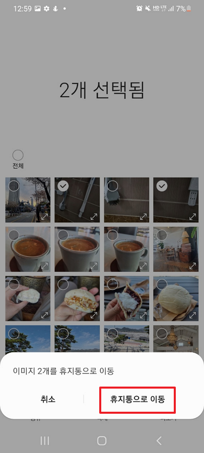 갤러리 - 더보기(세로로 점 세개 부분) 클릭 - 편집 - 삭제할 사진 선택 - 삭제 - 휴지통으로 이동