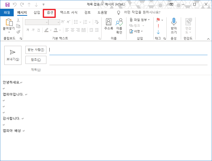 그럼 메일을 보내고자 하는 내용을 작성하신 후, 상단에 있는 [옵션]부분 탭을 클릭하여 주시길 바랍니다.