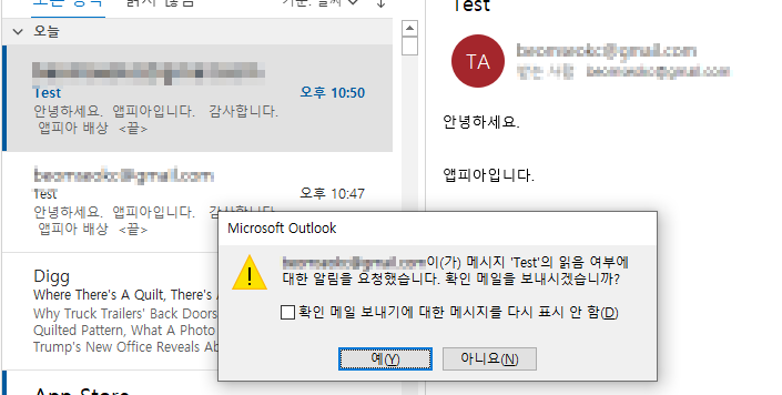 그래서 이번 포스팅에서는 위와 같이 아웃룩에서 상대방에게 읽음 안내를 띄우는 방법에 대해서 알아보도록 하겠습니다. 물론, 상대방이 GMAIL, NAVER등의 앱을 통해서 메일을 본다면 통하지 않고, 아웃룩을 통해서 메일을 열어 볼 때 나타납니다.