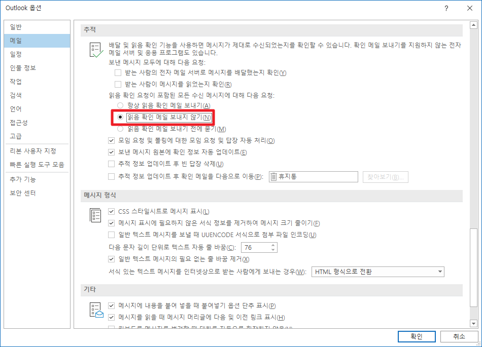 그럼 여기에서 스크롤을 계속 다운하시다보면, 추적 이라는 부분이 나타날 것입니다. 여기에서 읽음 확인 요청이 포함된 모든 수신 메시지에 대해 다음 요청에서 [읽음 확인 메일 보내지 않기] 부분을 선택해주시면 됩니다.