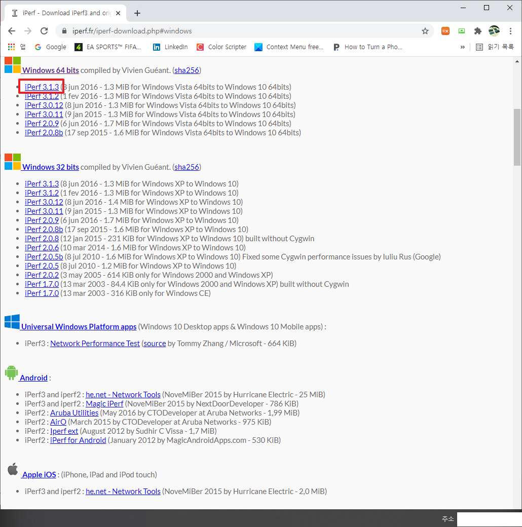 그럼 여기에서 다운로드 하고자 하는 버전이 있습니다. 여기에서 원하시는 버전을 선택해 주시면 됩니다. iPerf의 경우 이미 오래된 프로그램입니다. 그래서 원하시는 부분에 대해서 선택해주시면 됩니다. 저의 경우 현재 윈도우 64비트 기반의 최신 버전을 다운로드 받기 위해서 클릭을 하였습니다.
