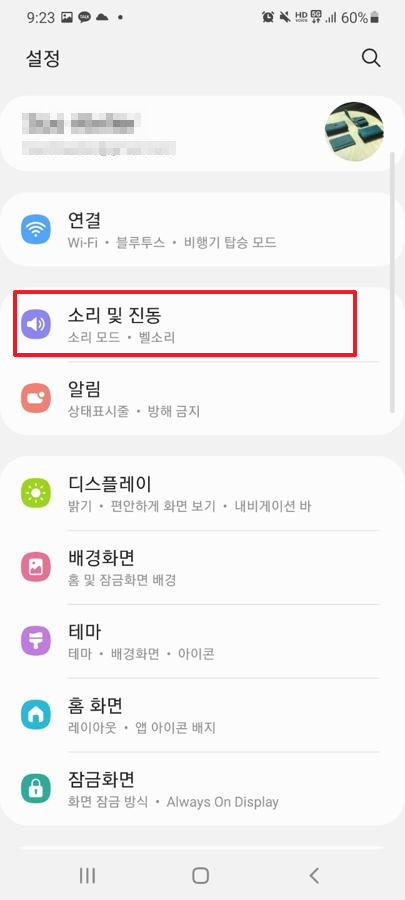 먼저, 화면에서 [설정]아이콘을 클릭하여 주시길 바랍니다. 그런 후에 우측에서 보이는 바와 같이 [소리 및 진동]부분을 클릭하여 주시길 바랍니다.