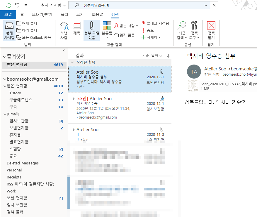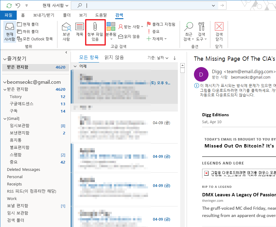 아웃룩[Outlook 365] 첨부파일 있는 메일 검색 하기