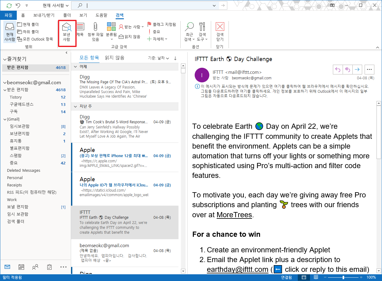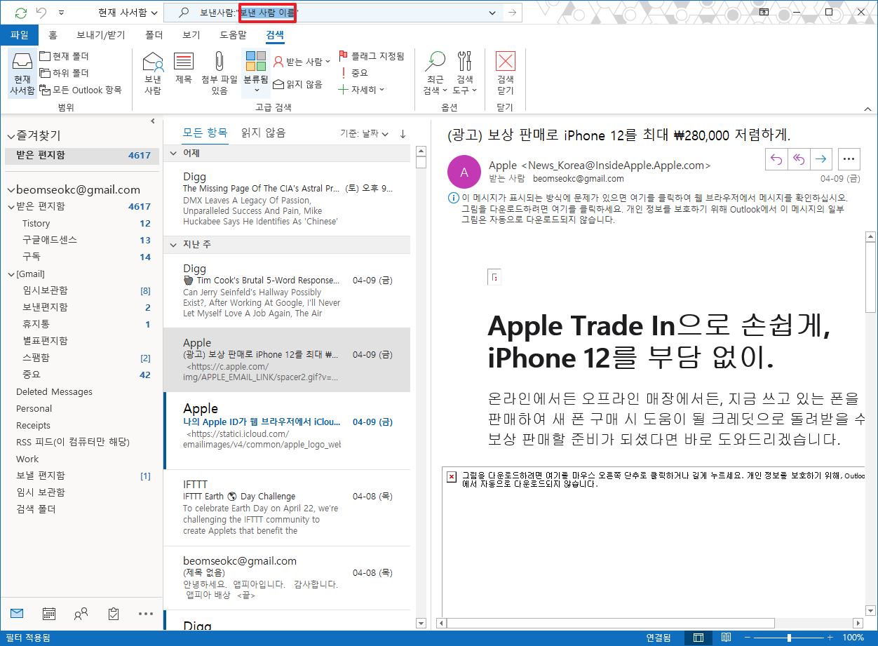이와 같이 두가지 방법을 이용하여 특정 사람에게 온 메일을 검색할 수 있습니다.