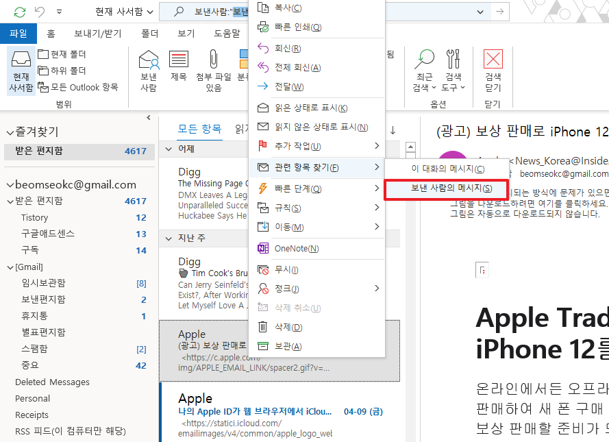 위에서 검색탭을 이용하는 방법도 있지만, 수신한 메일을 이용하는 방법도 있습니다. 일단, 수신한 메일중에 필터링한 메일을 선택하시고, 그런 후에 마우스 오른쪽 버튼을 누르시길 바랍니다. 여기에서 [관련 항목 찾기]부분을 선택하시길 바랍니다.