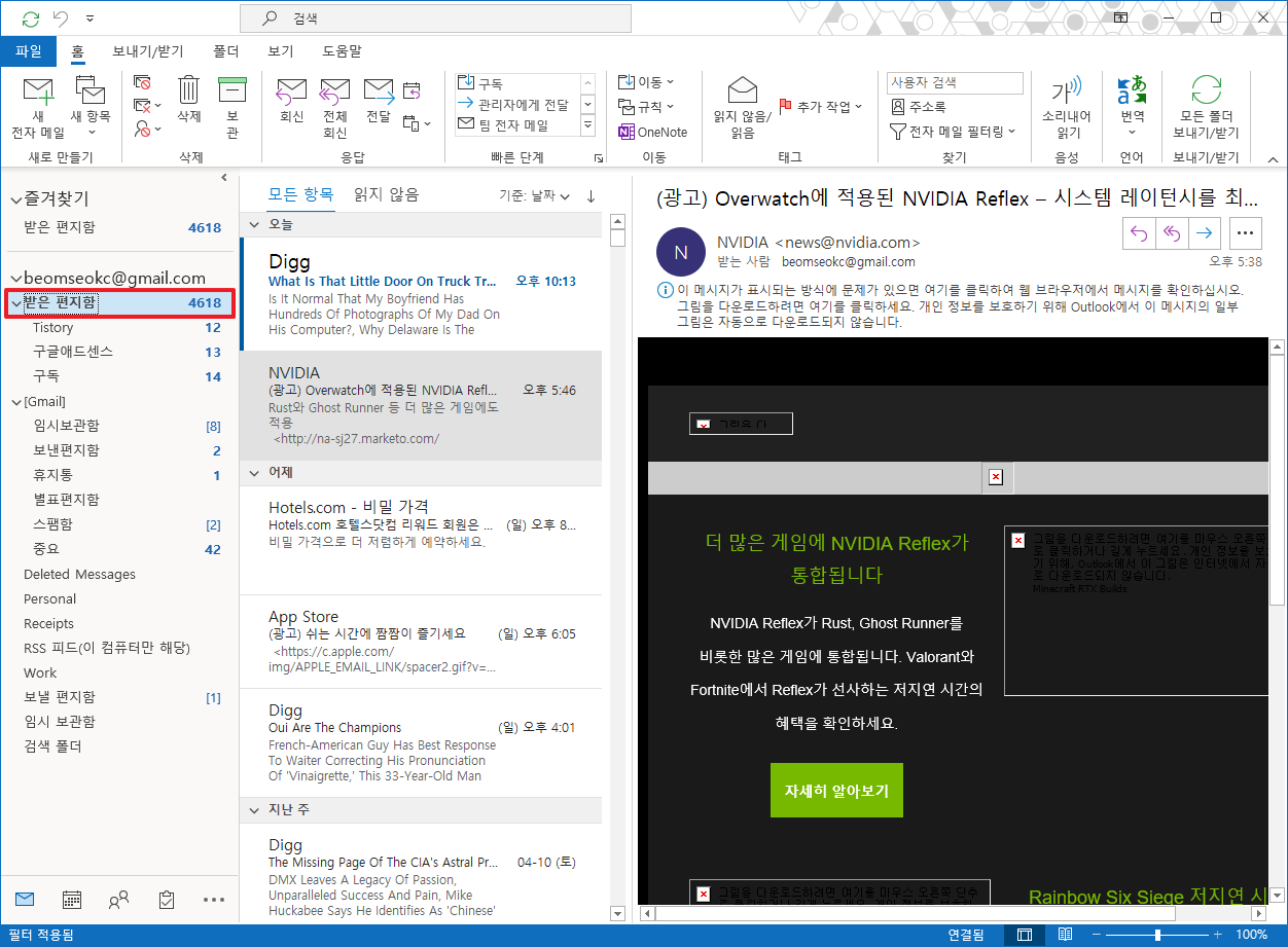 아웃룩[Outlook 365] 받은 편지함의 읽지 않은 메일 개수 대신 전체 수신 메일 개수 표시하기 본문