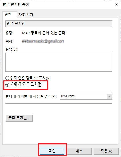 그럼 다음과 같은 받은 편지함의 속성이 나타납니다. 여기에서, [일반]에서 가운데 부분보시면, 기본으로 [읽지 않은 항목 수 표시]가 선택되어 있을 것입니다. 이부분을 [전체 항목 수 표시]로 변경하여 주시길 바랍니다.