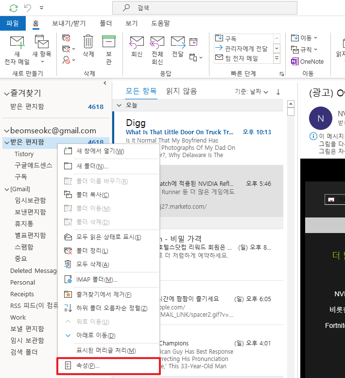 먼저, 받은 편지함 부분을 선택하신 후에 오른쪽 클릭하여 주시길 바랍니다. (제 메일을 모자이크 처리하려고 하다가, 어차피 아무도 그리 크게 관심이 없을 것 같아서, 남겨 두었습니다. ! 보시다 시피, 거의 잡지 및 광고뿐)
