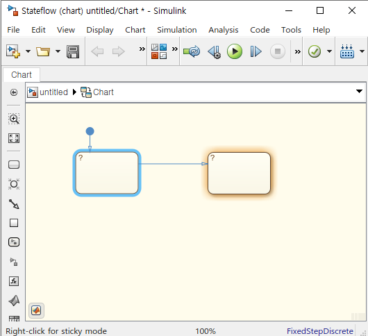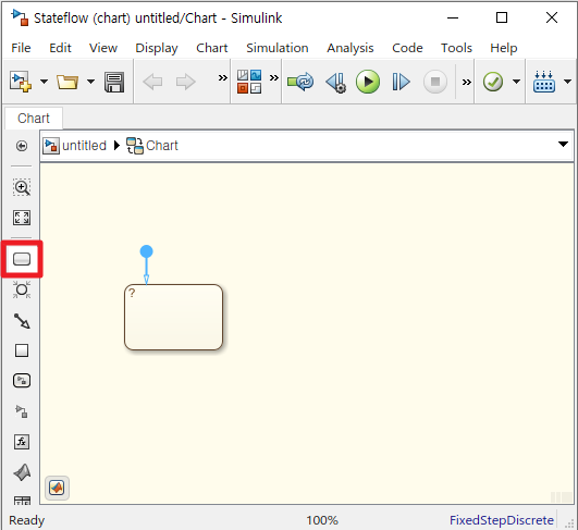 그러면 간단히 Stateflow에서의 Chart를 한번 봐 보도록 하겠습니다. 좌측 메뉴에서 사각형 모양의 아이콘이 State 입니다.