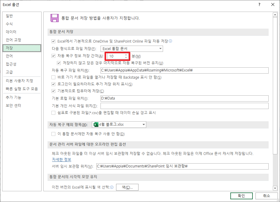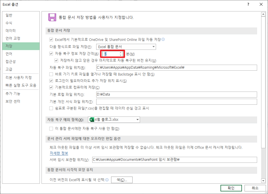 위에서 저장을 누르시면 다음과 같은 화면이 나타납니다. 여기에서 [자동 복구 정보 저장 간격]이라는 부분이 나타날 것입니다. 이 부분에 보이는 시간을 조절 해주시면 됩니다.