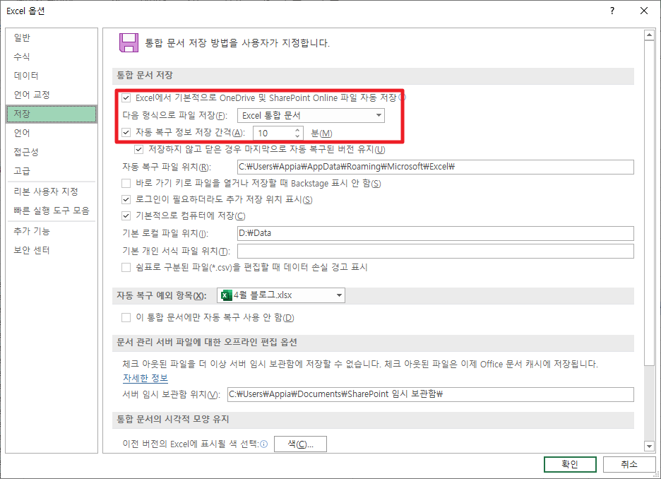 그럼 빨간 상자와 같은 부분에 체크되어 있는 부분들이 보일 것입니다. Excel에서 기본적으로 [OneDrive 및 SharePint Online 파일 자동 저장 / 자동 복구 정보저장 간격]부분이 체크되어 있을 것입니다. 이 부분들을 체크 해제하여 주시길 바랍니다.