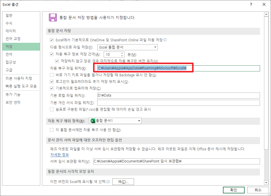 여기에서 옵션 부분의 저장 메뉴를 보시면, [자동 복구 파일 위치] 부분이 다음과 같이 보입니다. 여기에 있는 경로를 복사합니다.