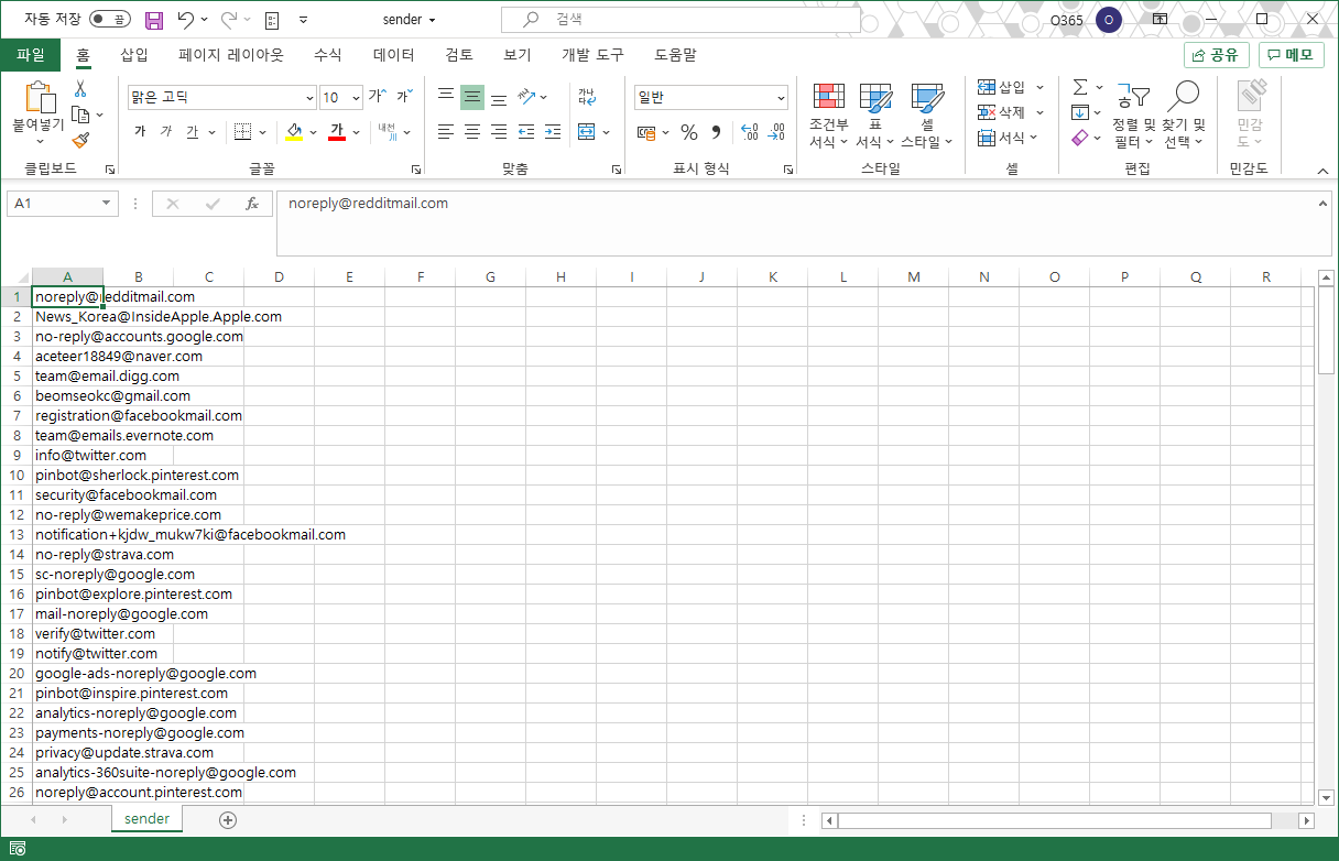 이와 같은 형태로 아웃룩에서 나에게 메일을 보낸 사람들의 주소를 CSV파일 형태로 추출이 가능합니다.