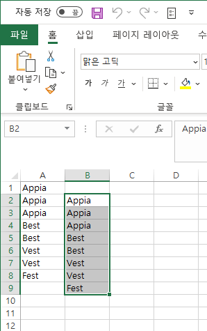 즉 위에서 보이는 부분과 같이 Copy(), Paste() 함수가 즉 기능을 이룹니다. 단 여기에서 주의해야 할 점은 바로 범위를 선택하는 sheet.Range("B2:B9").Select() 부분입니다. 실제 저의 경우 범위를 맞춰서 입력을 했지만, 범위를 맞추지 않고 "B2:B4"을 입력하더라도 동일한 결과가 나타납니다. 즉, 시작 칸만 맞춰지면 동일한 데이터가 쓰여지게됩니다.