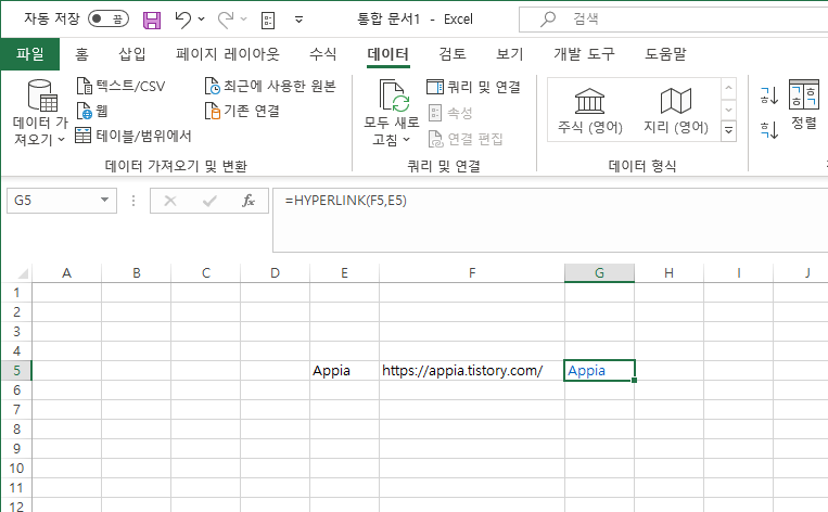 예시에서는 현재 블로그의 메인 주소인 https://appia.tistory.com/을 을 Appia라는 이름에 표시되도록 G5셀에 명시하도록 하겠습니다. 위의 함수를 완료하여 엔터 키를 입력하면 다음과 같이 셀의 값이 링크가 걸려서 나타나는 것을 알 수 있습니다.
