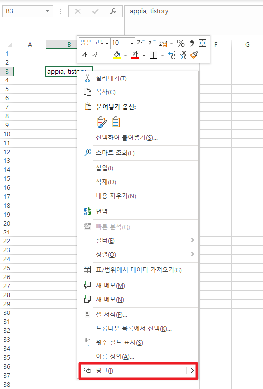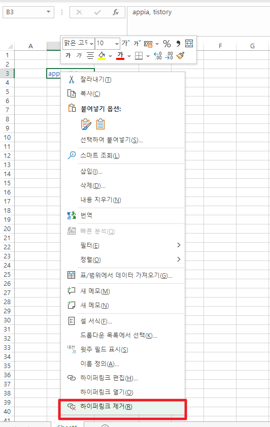 그럼 이번에는 관련된 생성된 하이퍼 링크를 제거해보겠습니다. 먼저 하이퍼링크가 생성된 셀을 선택하시고 나서, 마우스 오른쪽 버튼을 클릭하여 주시길 바랍니다. 만약, 한번 클릭시 앱페이지가 열리다면, 길게 눌려주시면 선택이 됩니다. 그리고 나서, 여기에서 하단에 [하이퍼링크 제거]부분을 클릭하여 주시길 바랍니다.