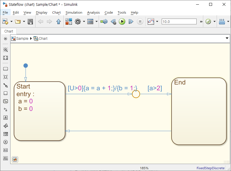 일단 앞서 Transition의 Condition이 U>0이 True일 경우 {a = a+1;}를 실행합니다. 하지만 a> 2가 되지 False일 경우 Transition Action은 실행되지 않습니다.