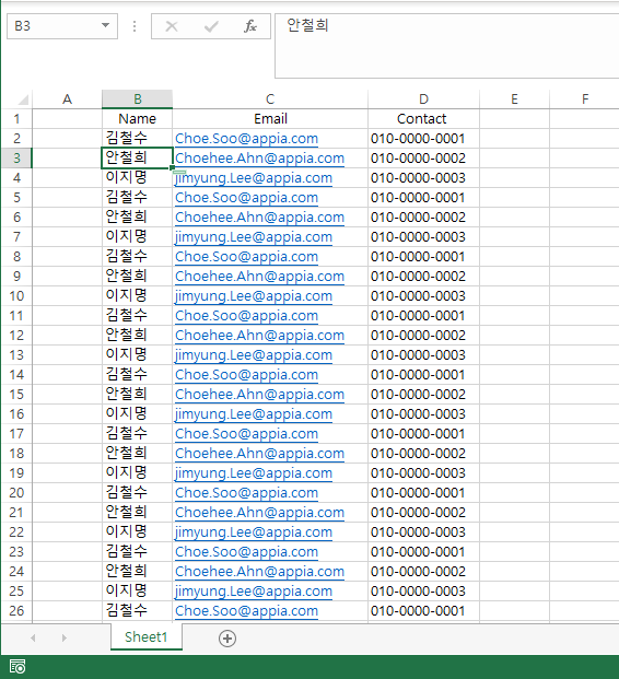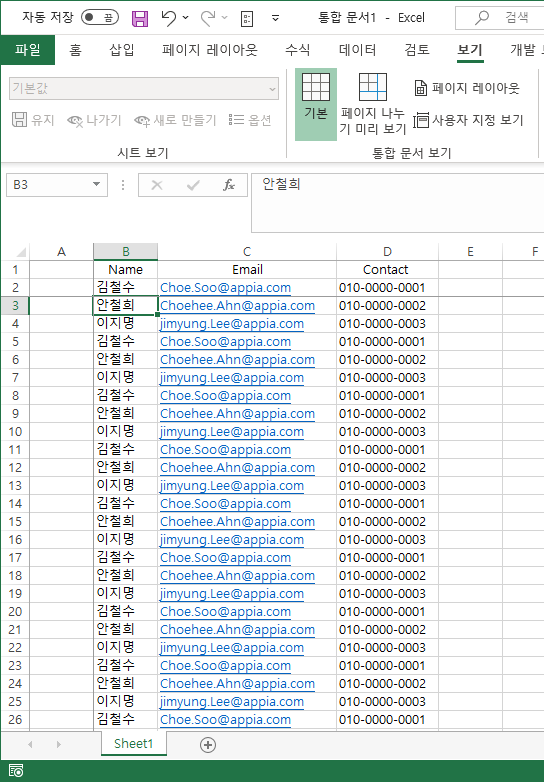 그래서 이번 포스팅에서는 틀 고정(특정 셀을 고정해서 보기)에 대해서 이야기를 해보고자 합니다. 먼저, 저는 다음과 같은 데이터를 가지고 있습니다. 이번 포스팅을 위해서 약간 예시를 만들었습니다.
