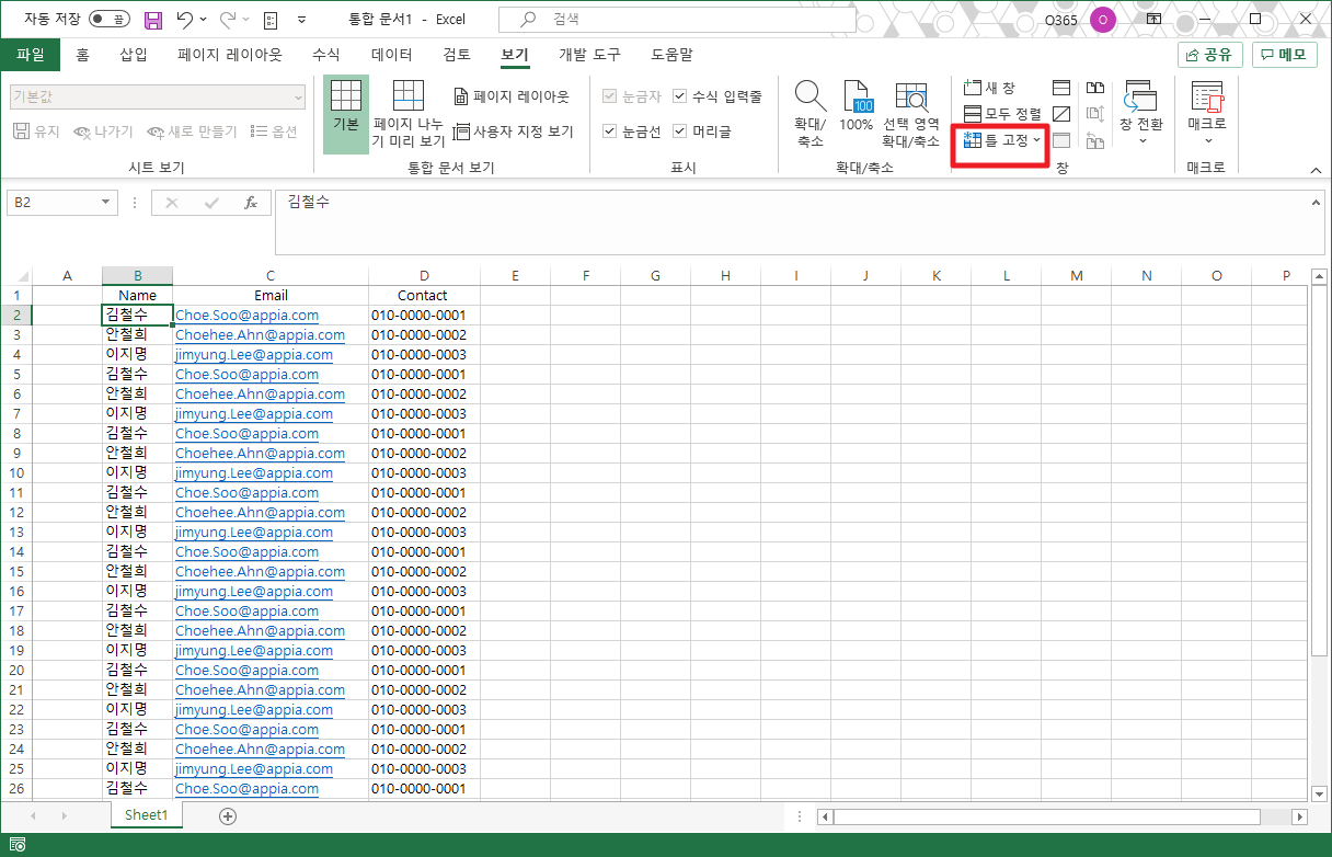 - 첫 행 고정 - 시트의 첫 행 고정하여 표시